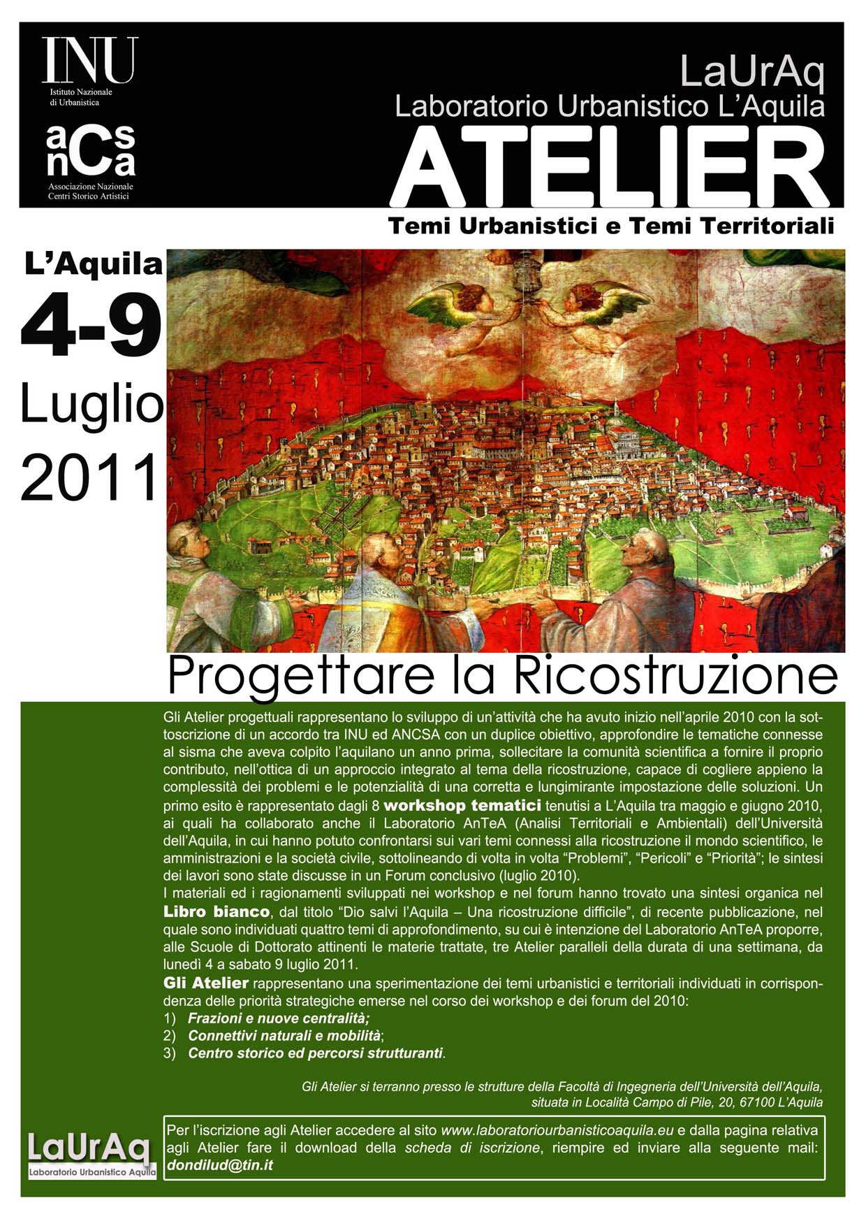Per confermare la partecipazione si invita a visitare il sito: http://www.laboratoriourbanisticoaquila.eu/ e accedere alla pagine degli Atelier per scaricare la scheda di iscrizione da inviare al seguente indirizzo: dondilud@tin.it.