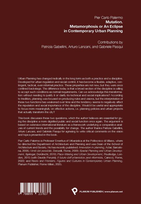 Il libro intende discutere le due questioni, che secondo l'autore sono fondamentali per restituire alla disciplina una funzione pubblica e sociale più dignitosa. La riflessione è fondata su una vasta letteratura internazionale, come quadro di riferimento per un'analisi comparata delle tendenze in atto e delle possibilità di cambiamento. L'autore ringrazia Patrizia Gabellini, Arturo Lanzani e Gabriele Pasqui, che hanno accettato di scrivere un commento critico sulla visione e sugli argomenti che il libro propone.